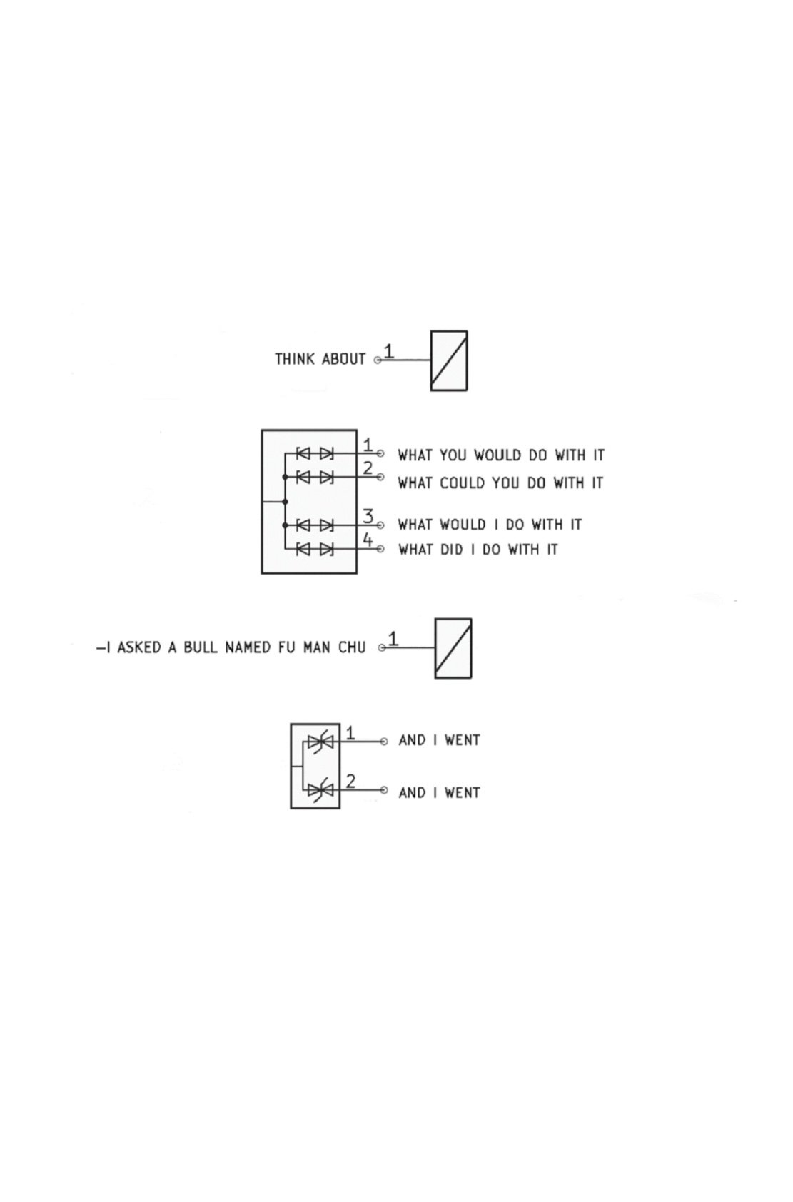 Wry n.12 / Constraint based dismantling of two plus decades worth of hit contemporary country lyrics by Texas born & raised, Coleman Edward Dues. By isolating phrases/words/letters & then grafting them to electrical schematics, these concrete & minimal poetry inspired pieces unpeel & expose varying levels of artifice, even as they somewhat hilariously manage to embody a sense of the author's place & persona.