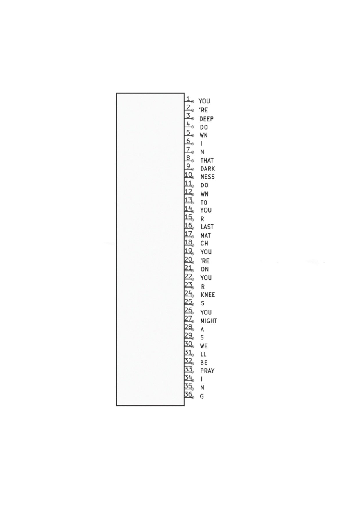 WHAT FOLLOWS HAS BEEN COLLAGED FROM EVERY BILLBOARD NUMBER ONE COUNTRY SONG OF THE YEAR FROM THE YEAR OF MY BIRTH (1996) TO THE MOST RECENT YEAR AVAILABLE (2019). I INDICATE THE TITLE AND DATE OF THE SOURCE SONG FOR EACH SCHEMA IN THE TOP LEFT-HAND CORNER OF EACH PAGE. I ALLOW MYSELF TO REPEAT, REARRANGE AND OMIT, BUT NEVER TO INCLUDE A WORD WHICH DOES NOT EXIST IN THE ORIGINAL SOURCE LYRICS, SAVE FOR ONE INSTANCE IN WHICH I REMOVE A LETTER FROM A WORD TO FORM A NEW WORD - (C.E.D.)